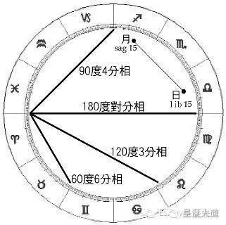 上图中标识出了4种最常见的相位,比如太阳在天秤15度,和在射手15度的月亮相差60度,所以正好形成一个严格的六分相,同样的,如果月亮在摩羯15度,就会和太阳形成一个四分相,双鱼15度是三分相,而白羊15度则是对分相。图中还有一个没标识出的重要相位是合相(古典占星理论有认为这不是一个相位,而是两颗行星实在的结合)。顾名思义,就是月亮如果也在天秤15度,和太阳重合,则就形成合相。